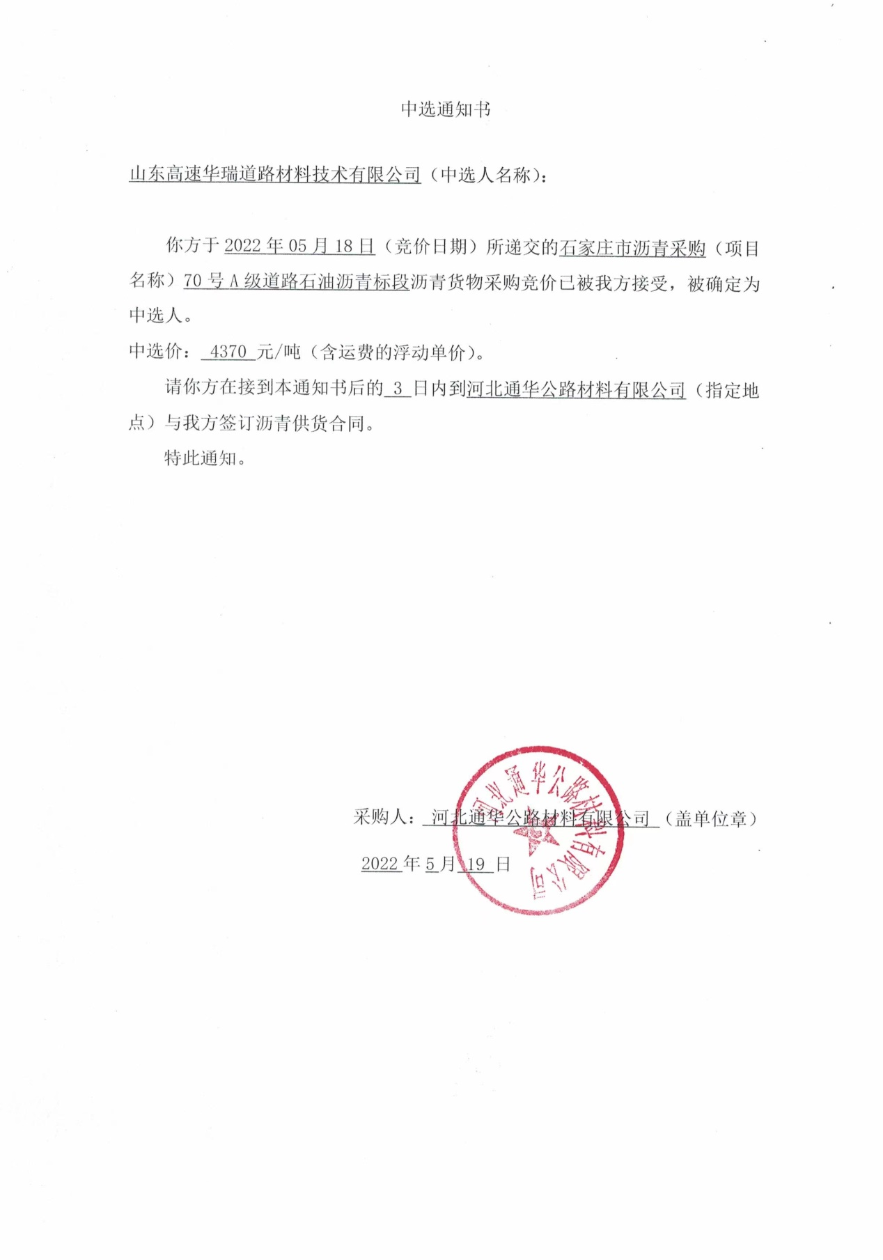 近日,山東高速華瑞公司成功中選河北通華公路材料有限公司石家莊市瀝青采購項目。