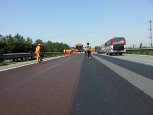 長深高速(濱州段)微表處養(yǎng)護(hù)維修工程山東省養(yǎng)護(hù)重點(diǎn)工程之一,上圖為濱州養(yǎng)護(hù)處正在進(jìn)行微表處養(yǎng)護(hù)施工。施工后路面破乳時間短,路面強(qiáng)度上的快,減少了路面開放交通時間,得到了用戶的好評。