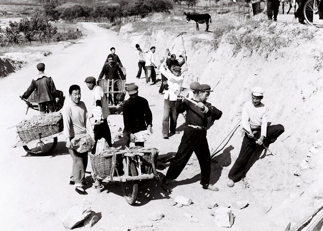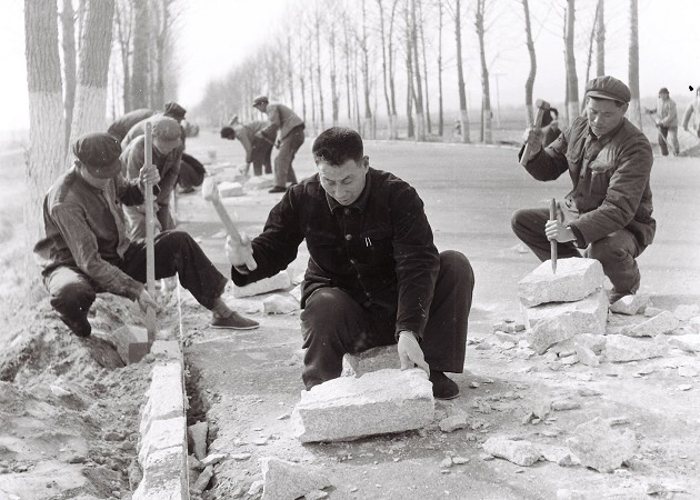 那時(shí)候修路就是“四大件”:鐵锨、大鎬、石夯、小推車,修路全靠掄大鎬、鐵锨,肩扛人抬小車推。