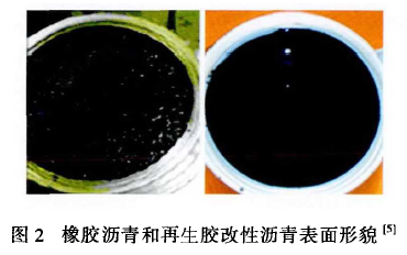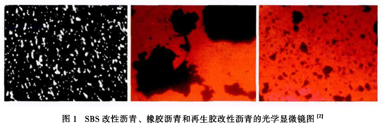 聚合物改性劑一般可分為三類:樹脂類,如聚乙烯(PE)、乙烯-醋酸乙烯共聚物(EVA)等;熱塑性彈性體類,如苯乙烯-丁二烯嵌段共聚物(SBS)、苯乙烯-異戊二烯嵌段共聚物(SIS)、聚氨酯、有機(jī)硅氧烷等;橡膠類,如丁苯橡膠(SBR)、無歸聚丙烯(APP)、廢膠粉(GTR)等。顯微鏡圖見圖1。