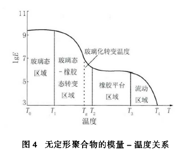 無定形聚合物的模量隨溫度變化表現(xiàn)出4種不同的狀態(tài),分別對(duì)應(yīng)聚合物的玻璃態(tài)、玻璃態(tài)-橡膠態(tài)轉(zhuǎn)變、橡膠態(tài)和黏流態(tài)。見圖4。玻璃化轉(zhuǎn)變溫度是聚合物由玻璃態(tài)至橡膠態(tài)轉(zhuǎn)變對(duì)應(yīng)的溫度,此時(shí)材料由脆性轉(zhuǎn)變?yōu)閺椥誀顟B(tài)。聚合物改性瀝青從廣義上屬千聚合物范疇,其低溫開裂的實(shí)質(zhì)是瀝青在實(shí)際使用溫度時(shí)處于玻璃態(tài),從而發(fā)生脆性斷裂,該現(xiàn)象與其粘彈性行為相對(duì)應(yīng)[18]。因此,可用玻璃化轉(zhuǎn)變溫度評(píng)價(jià)瀝青的低溫性能。材料的玻璃化轉(zhuǎn)變溫度越低越好,當(dāng)其遠(yuǎn)低千改性瀝青的最低服務(wù)溫度時(shí),瀝青材料處于高彈性,通過變形可有效釋放溫度變化引起的內(nèi)部應(yīng)力,減少低溫開裂的產(chǎn)生。